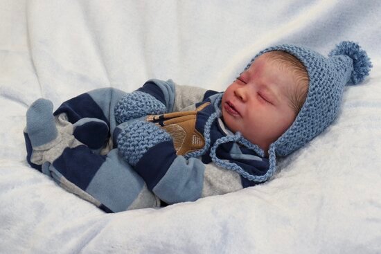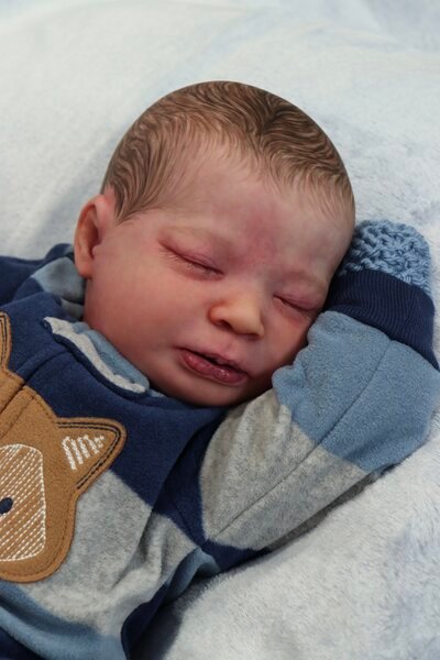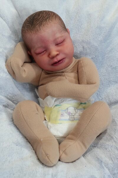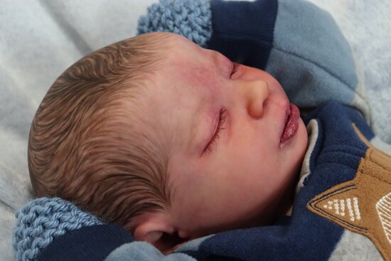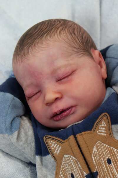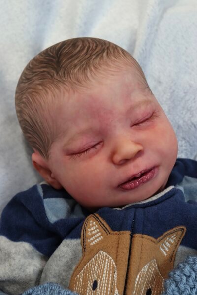 Sage has been given layers of skin tones, mottling, under-toning, veining and capillaries, shading, and blushing using Psycho Paints and Silc Pig pigments and matted with Silicone Velvet Matting Powder. He has a detailed newborn complexion.