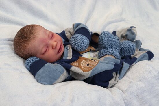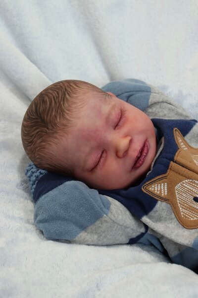 He has painted dark brown hair and painted barely there baby eyebrows. His eyelashes have been rooted with premium mohair.